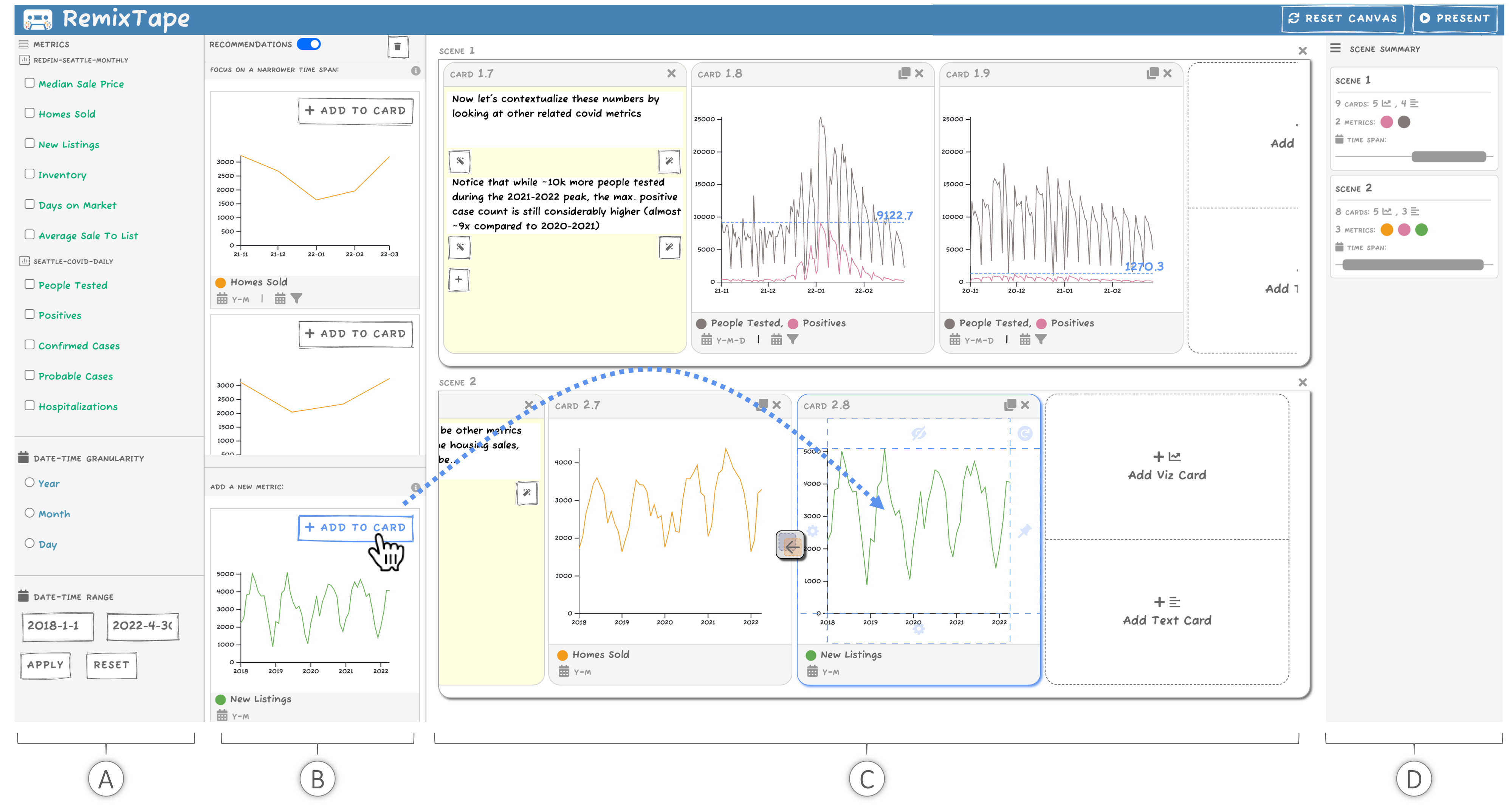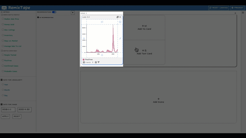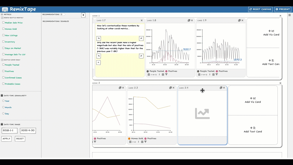 With this inspiration in mind, let’s take a brief look now at its functionality. RemixTape is a presentation authoring tool with multiple views. There’s a presentation canvas where we find scenes containing visualization cards and text cards. We have a browser to collect metrics from different data sources, and a recommendation list of new visualization cards to add to the canvas.